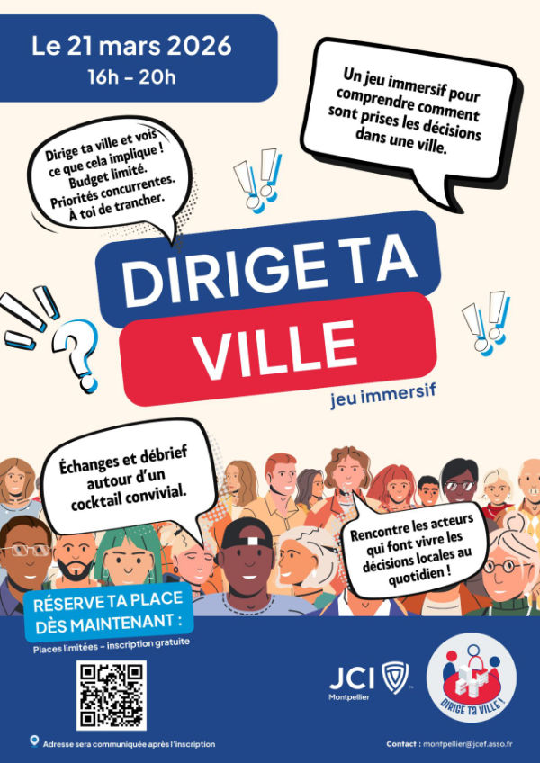 La JCE de Montpellier attend 50 jeunes samedi 21 mars, de 16h à 20h, au centre-ville, pour une immersion ludique dans la prise de décision publique. Les participants au jeu Dirige ta Ville se mettront dans la peau de décideurs locaux afin de mieux appréhender la complexité des choix municipaux, les contraintes institutionnelles et les responsabilités des élus. Répartis en équipes, ils devront notamment gérer un budget limité, débattre et défendre leurs propositions, arbitrer entre différentes priorités pour leur ville et prendre collectivement des décisions ayant un impact sur le territoire. Les participants auront aussi l’occasion d’échanger avec des agents publics chargés de mettre en œuvre les décisions municipales.