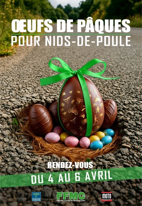La Fédération Française des Motards en Colère (FFMC) veut mobiliser l’ensemble des usagers de la route pour signaler les défauts dangereux des chaussées en les décorant d’œufs et de paille du 4 au 6 avril 2026. Il s’agira de la 6e édition de l’action « Œufs de Pâques pour nids-de-poule » destinée à dénoncer le mauvais état du réseau routier français, en partenariat avec la Mutuelle des Motards et Moto Magazine.